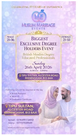 This event is specifically arranged for British Muslim degree-educated professionals who are looking for a life partner. All participants are required to show: